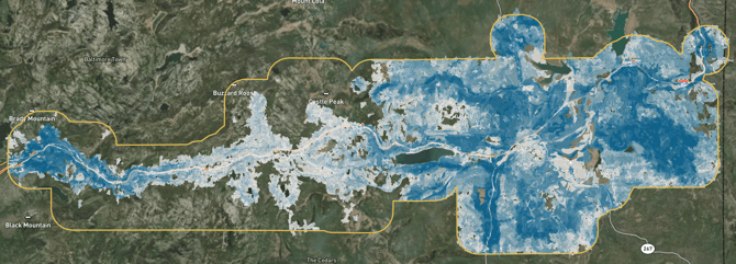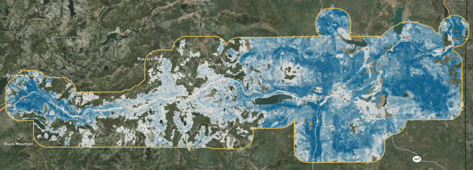 Vibrant Planet helps make the comparison of these objectives possible. As partners weigh their objectives, the platform maps the highest opportunities for resilience opportunity on a per-acre basis. The darker the blue polygon, the higher the opportunity to increase resilience, based on that objective. As objectives shift, the maps shift.